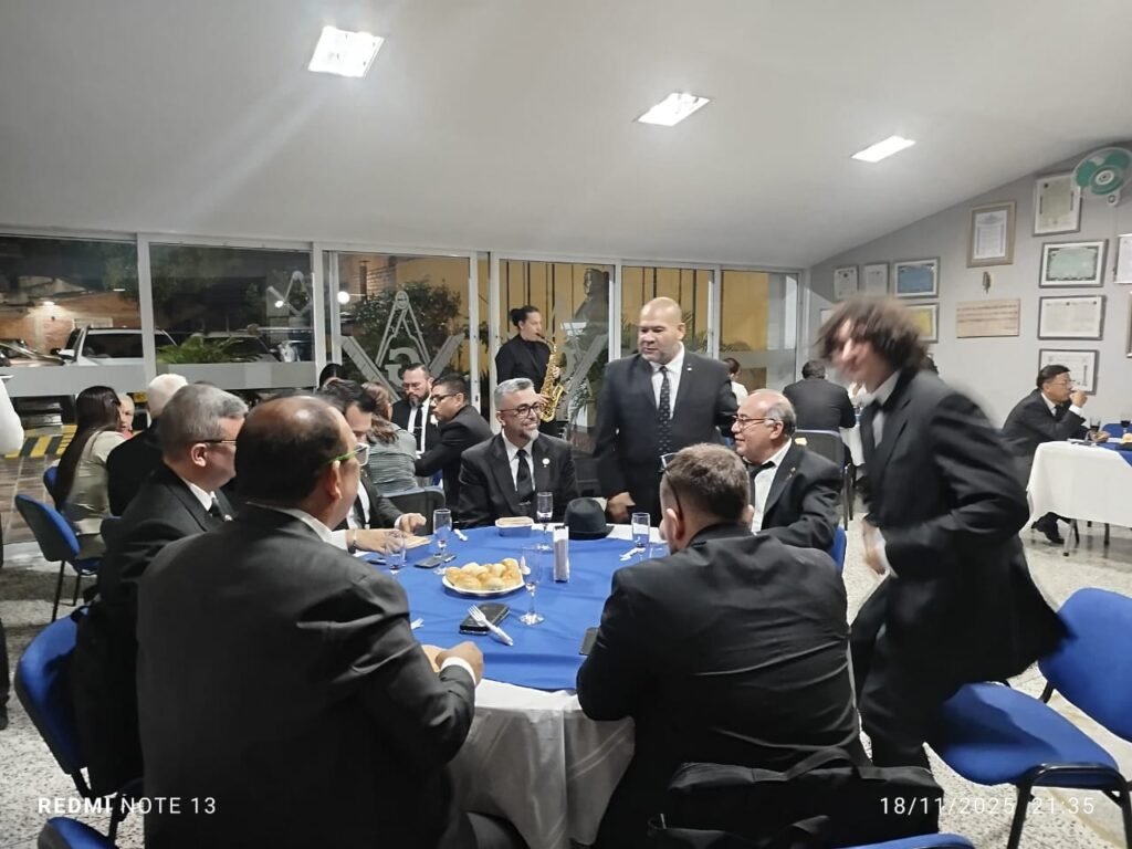 Además, se llevó a cabo una tenida blanca que reunió a familiares y amigos, incluyendo cuñadas y sobrinos, quienes compartieron momentos de alegría y fraternidad. La velada continuó con un brindis en honor a este importante aniversario, seguido de una cena especial y música que amenizó la noche, creando un ambiente de camaradería y celebración.